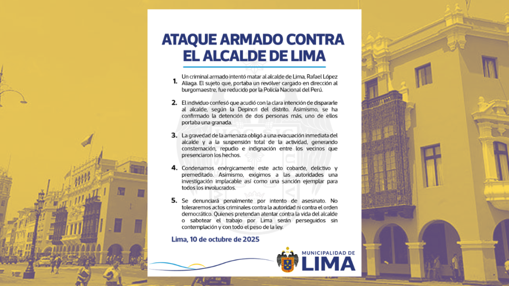 Cabe señalar que Municipalidad de Lima difundió inicialmente un comunicado calificando el hecho como un “acto delictivo y premeditado” y que “el individuo confesó que acudió con la clara intención de dispararle al alcalde”. No obstante, la Fiscalía determinó que no existían indicios de atentado ni de homicidio calificado, y el Poder Judicial dictó nueve meses de prisión preventiva contra Pizango únicamente por tenencia ilegal de armas.