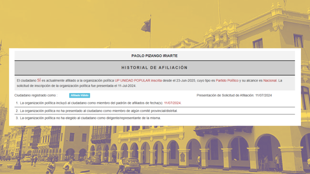 El detenido, Pizango, negó cualquier intención delictiva y afirmó que su presencia, en realidad, respondía a su simpatía política hacia López Aliaga, aunque actualmente se encuentra afiliado a la organización política progresista UP Unidad Popular. Su defensa sostiene que fue “sembrado” con el arma por parte de agentes o terceros, alegando que no pertenecía a un plan de ataque, sino que se encontraba en el lugar como parte del público. “Este caso tiene intereses políticos”, afirmó.