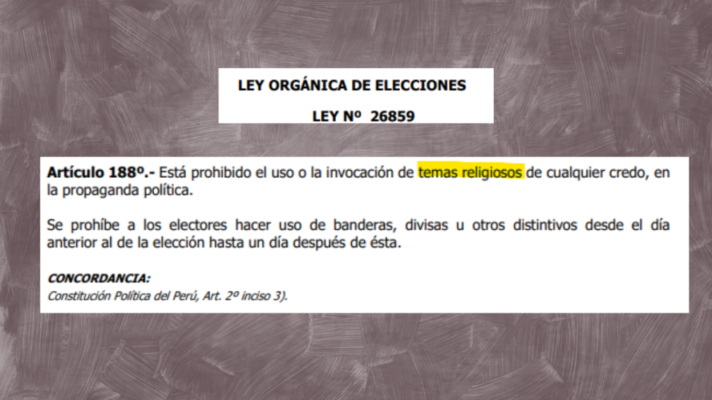 Ambos sostienen que la prohibición del Jurado Nacional de Elecciones de invocar a Dios o utilizar símbolos religiosos en campaña electoral o actos proselitistas constituye una persecución contra los cristianos y una amenaza a la civilización occidental. Sin embargo, este planteamiento no solo es incorrecto, sino profundamente peligroso para una democracia plural y laica como lo es la peruana.
