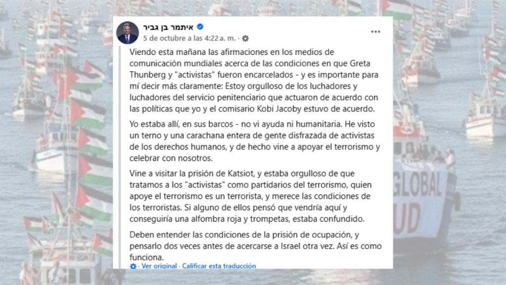 Durante su arresto, Thunberg escuchó repetidamente insultos y acusaciones de terrorismo. “Eres Hamás, eres una terrorista, quieres matar bebes judíos”, les gritaban los solados. Además, el ministro de Seguridad Nacional de Israel, Itamar Ben Gvir, publicó en redes sociales que se sentía “orgulloso” de que las FDI trataran a los activistas como “partidarios del terrorismo”.