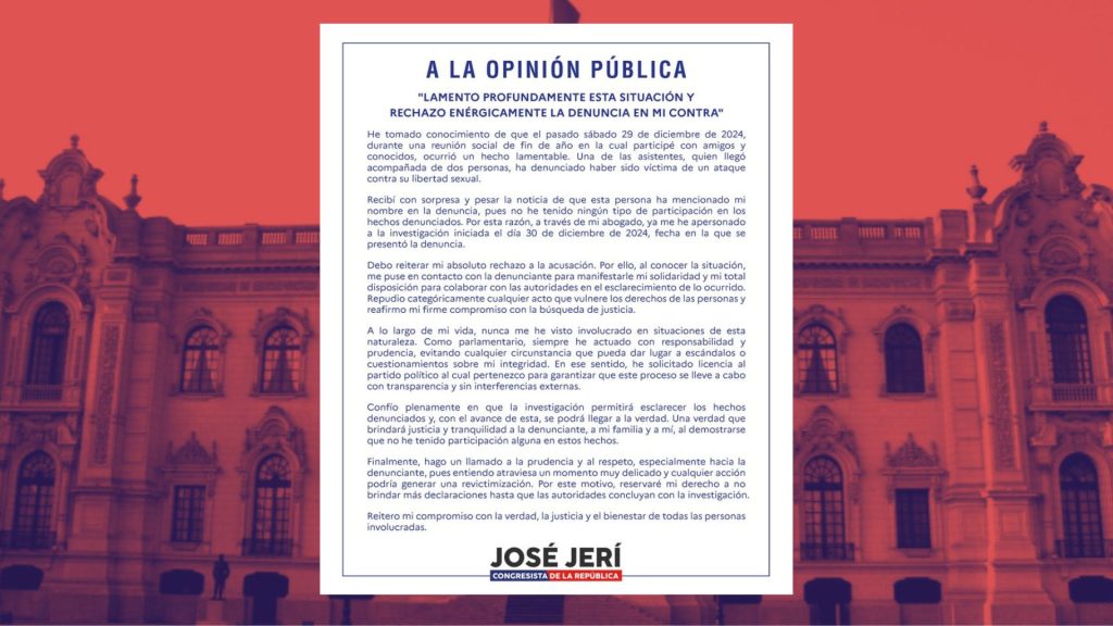 El inicio de su gestión se ha visto empañado por acusaciones judiciales previas. En enero de 2025, Jerí fue denunciado por presunta violación en una fiesta de Año Nuevo en Canta. Aunque la causa fue archivada por falta de pruebas concluyentes, un juzgado le impuso medidas de protección a la denunciante y dispuso un tratamiento psicológico por “conducta sexual patológica”. Diversos reportes de prensa incluidos Perú21 y El País sostienen que el entonces congresista no habría cumplido plenamente dicha orden.