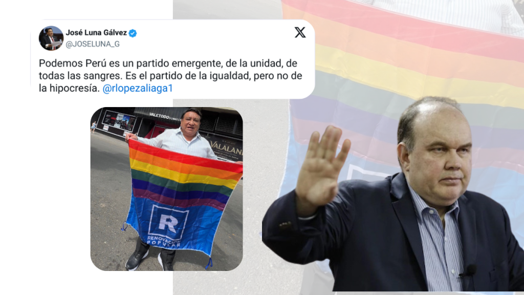 La provocación se completa con una imagen: “Pepe” Luna sosteniendo la bandera LGTBI, superpuesta sobre el logo de Renovación Popular. El mensaje es claro y deliberado.