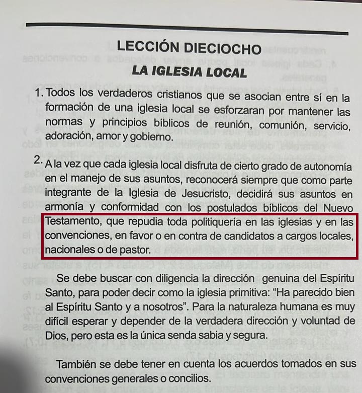 En la lección dieciocho, el texto es explícito y no deja lugar a interpretaciones ambiguas o connotativas. Reconoce que, sí bien cada iglesia local goza de autonomía administrativa, sus practicas deben realizarse en armonía y conformidad con los principios que rigen la doctrina religiosa. Según el propio documento, se debe repudiar toda politiquería en las Iglesias y en las convenciones, ya sea a favor o en contra de candidatos.